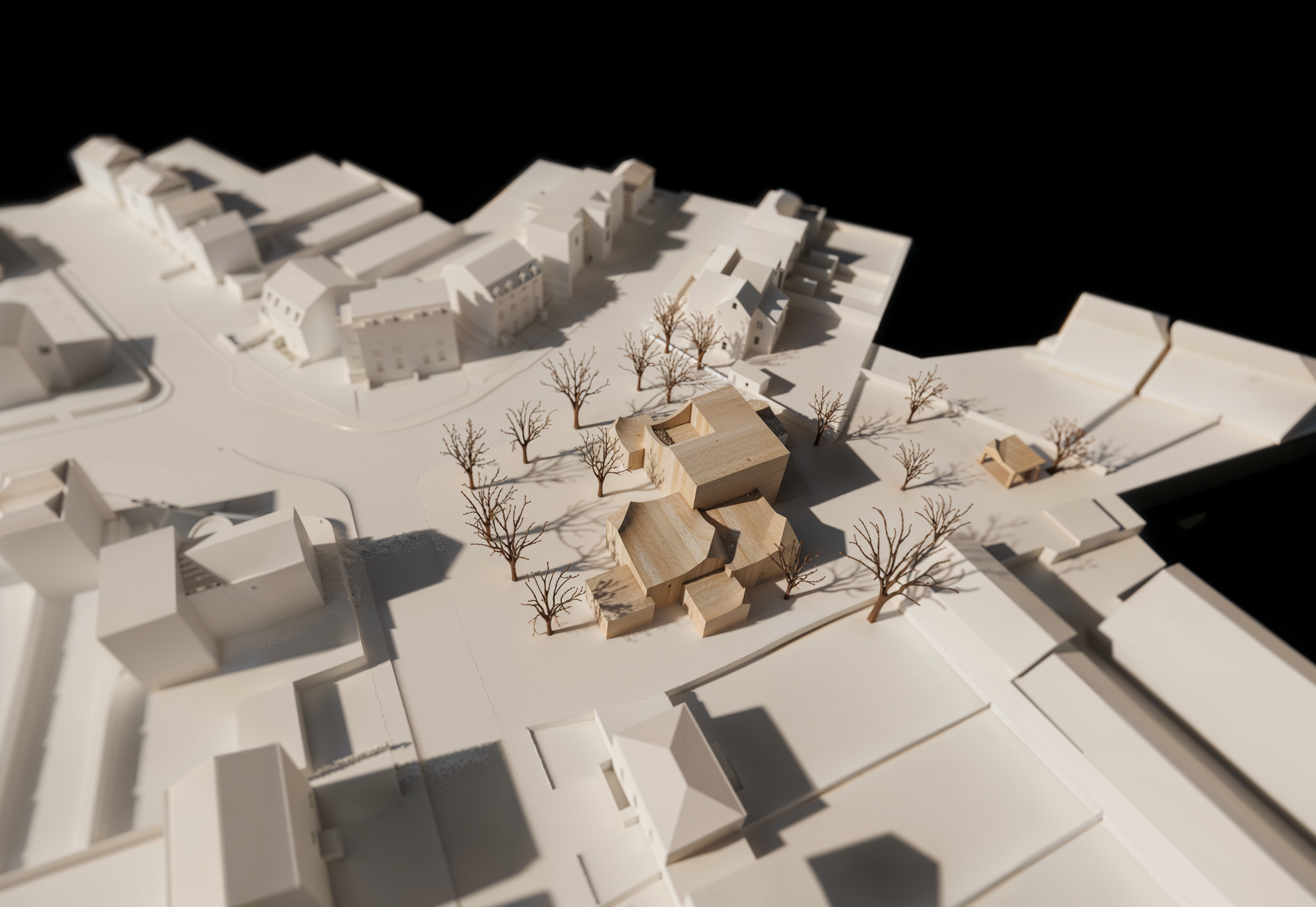 An interesting roof form is created by carving the building volumes in relation to the surrounding trees.