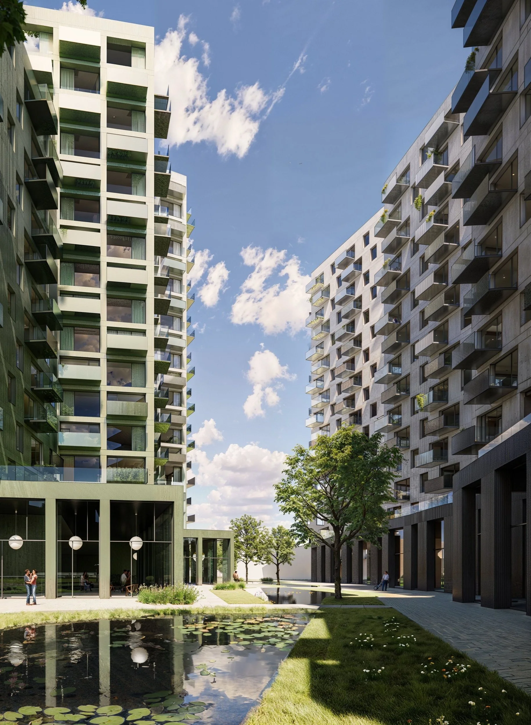 Our approach seamlessly integrates landscape and architecture. By arranging the buildings in a geometric, finger-like formation, we create a balance between open, long views through the development and intimate, enclosed garden clusters inspired by the English Garden tradition.